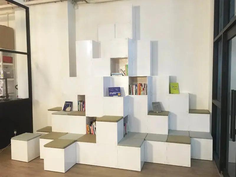 - Les cubes sont plus flexibles dans leur usage. Ils peuvent être utilisés comme assise, table Velleda (avec des plaques Velleda ajoutées), mur de travail Velleda, mais aussi pour toute autre construction susceptible de résonner avec le groupe.